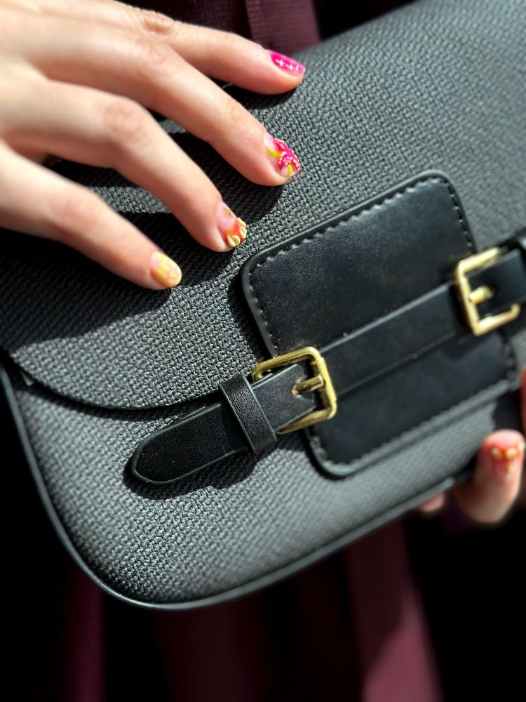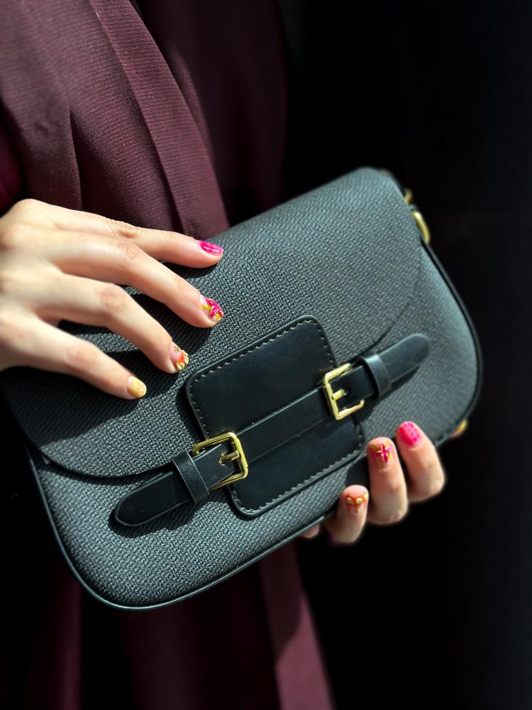 Crafted from textured fabric with smooth faux leather details, and finished with dual gold buckles that add a timeless, structured charm.